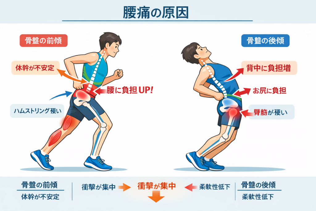 走るときの衝撃を骨盤がうまく受け止められないと、腰に負担がかかります。
