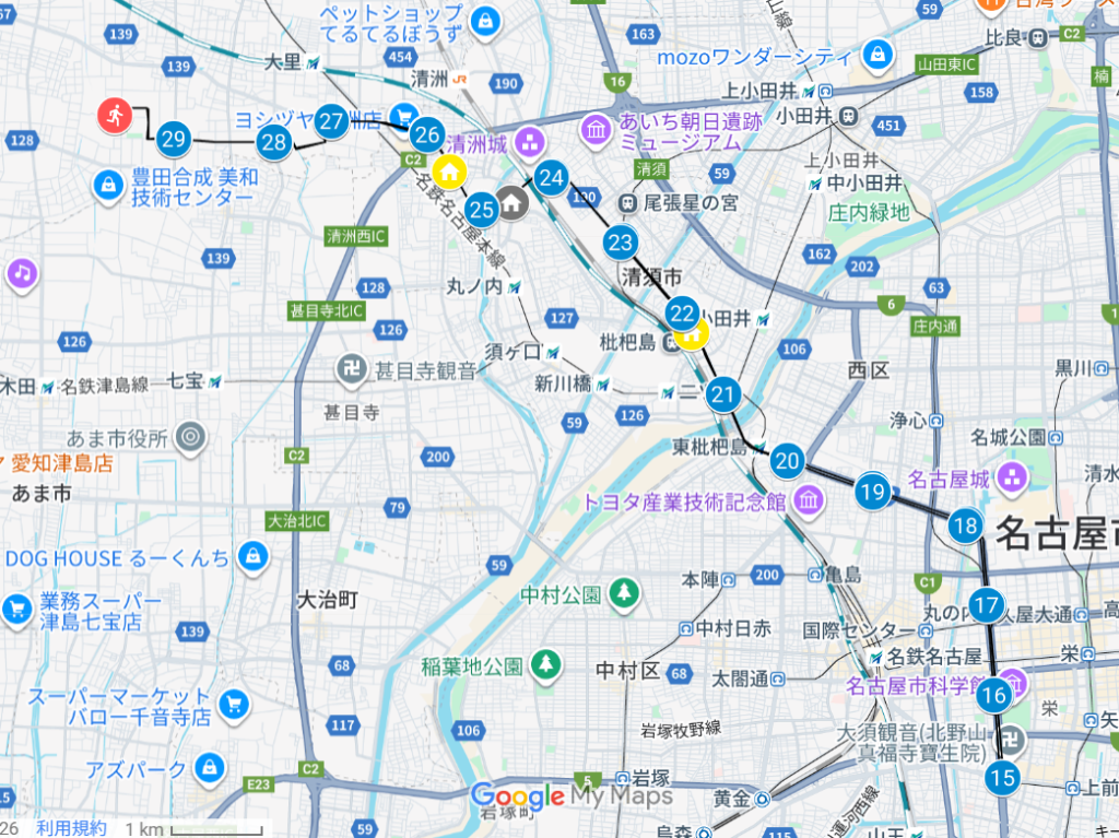 10分ほどのウォーミングアップを行い、ぽかぽか温泉から大須観音を目指して走ります。15km先の大須観音にて15分ほど休憩します。大須観音を折り返し地点にしてぽかぽか温泉に戻っていきます。